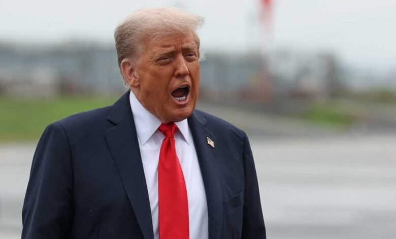 U.S. President Donald Trump speaks upon his arrival at La Guardia Airport in New York for the U.S. Open men’s tennis final, U.S., September 7, 2025. REUTERS/Evelyn Hockstein