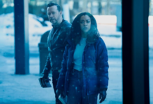 A fabulous kitchen is a brownstone dream, with a 36-inch Wolf range, integrated Subzero refrigerator, paneled dishwasher, and microwave drawer to do the heavy lifting. A stone-clad island and backsplash provide contrast to the dark navy millwork. At the back are floor-to-ceiling glass doors that open out onto the deck.