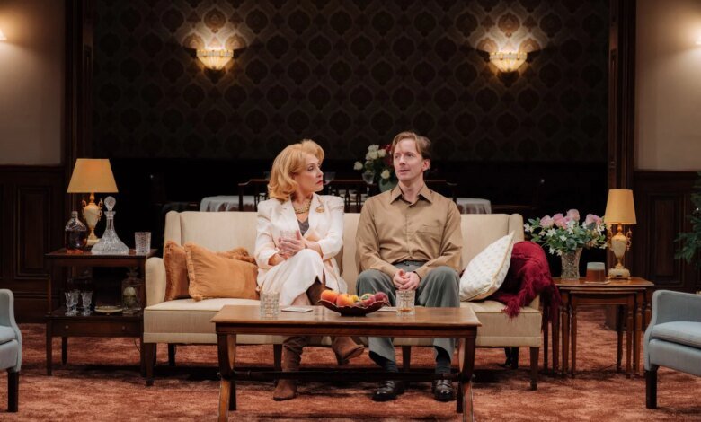The second half is set during the Christmas before George W Bush’s inauguration. Julie’s husband Ben (Daniel Abelson) has died years ago and a sense of decline hangs in the air. The apartment is shabbier now, with leaky ceilings, and Julie’s money woes are symbolised by a static, dimly-lit room. In the corner a puny Christmas tree, a shadow of the centre stage fir of 20 years ago, is braced for the desultory decorations Faye and Jeff will inflict upon it. Widowed Faye is thriving, in blow-out blonde hair, cream suit and designer bag, surprised to find herself missing marriage to blunt Mort (David Kennedy) – “we were never Tevye and Golde.”