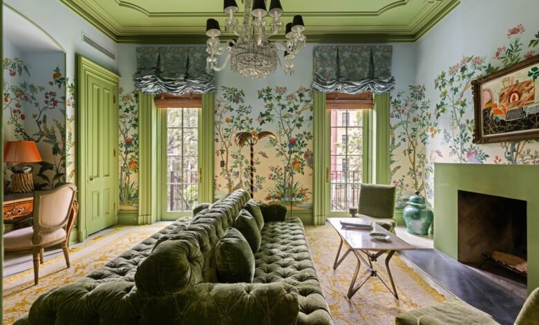 The late-19th-century brownstone does indeed span four floors, with the main parlor level a showcase of whimsy with its traditional crown moldings and fireplace anchoring colorful Zuber wallpaper. Glass doors lead to a celeb-worthy backyard with a sauna and cold plunge.