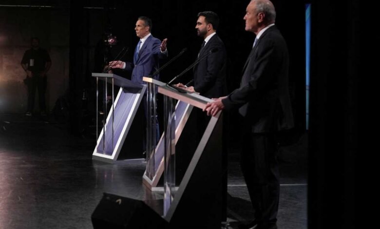 Independent candidate former New York Gov. Andrew Cuomo, Republican candidate Curtis Sliwa and Democratic candidate Assemblyman Zohran Mamdani participate in a second New York City mayoral debate at the LaGuardia Performing Arts Center at LaGuardia Community College in Long Island City, Queens, New York, October 22, 2025. Hiroko Masuike/Pool via REUTERS
