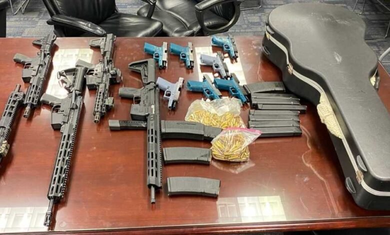 Ghost guns, assault rifles, high-capacity magazines, ammunition and a guitar case where guns were hidden were recovered from an Elmhurst garage defendants used to store weapons.