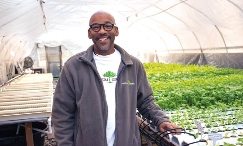 Tony Hillery working in the Harlem Grown urban farm greenhouse.
