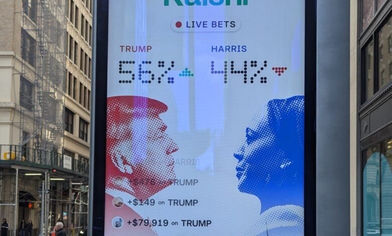 A digital billboard in New York City shows Kalshi’s odds for the 2024 presidential election on Oct. 16, 2024. Gaming regulators in Nevada are warning licensees that they cannot operate sports event contracts without a sports betting license. (Image: Shutterstock)