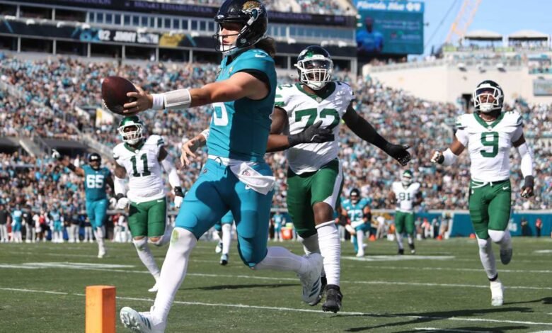 Dec 14, 2025; Jacksonville, Florida, USA; Jacksonville Jaguars quarterback Trevor Lawrence (16) scores a touchdown during the first quarter against the New York Jets at EverBank Stadium. Mandatory Credit: Morgan Tencza-Imagn Images