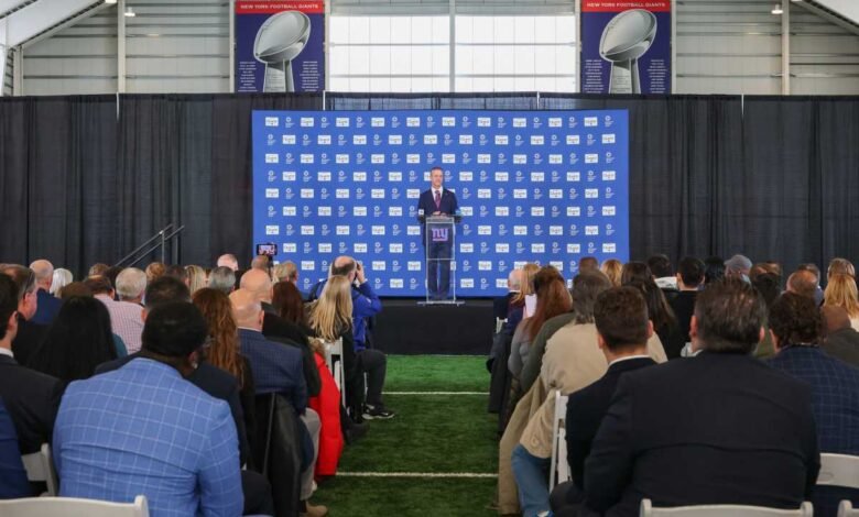 Jan 20, 2026; East Rutherford, NJ, USA; New York Giants head coach John Harbaugh speaks at the press conference announcing his hiring at Quest Diagnostics Training Center. Mandatory Credit: Ed Mulholland-Imagn Images