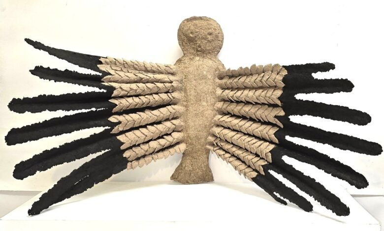 Dorothea is also the German-born wife of Rabbi Jonathan Magonet and it’s perhaps unsurprising then, that however tranquil and meditative most of these artworks seem, there is an undertow of unease in some of them. This is most obvious in one of the largest works on show, Open – Scorched Wings, which takes the form of an Icarus-like winged figure crafted out of packaging materials, marble dust and ink, but it can also be detected in other smaller works such as Burnt and Bound. She says she is preoccupied with “experiences of power, weakness, fragility, pain and tenderness” and in the light of the deeply troubling state of the world, her attempt to find “expression for aspects of my internal world and … to make some sense of external events” inevitably takes on a deeper, darker meaning.