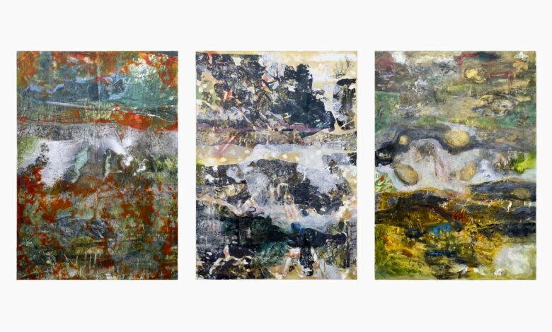 This thread of natural destruction is interwoven with the devastation and trauma of 7 October, offering a further, metaphorical, layering. The Falcon…, for example, aims to convey a sense of doom and the artist’s feelings about the war in the Middle East. The series was named from an excerpt of the poem The Second Coming by WB Yeats, which he wrote after World War I and the flu epidemic of the time, both of which devastated whole communities. The title of the poem, which is usually a Christian reference to the return of Christ to save the world from the final battle of destruction, can be seen instead as a powerful evocation of the dark times we all seem to be in presently.