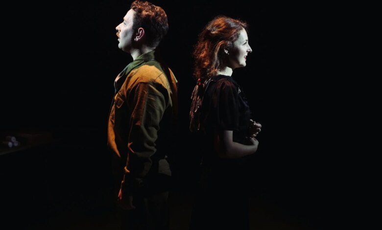 At the play’s London premiere at the Arcola Theatre, the staging is a triumph that draws in the audience from the getgo. Designer Robert Innes Hopkins gives each protagonist one half of the stage to represent their ‘world’. Jack has a utilitarian army desk, Louise a showy quill pen with which she makes dramatic flourishes in the air. While sharing thoughts, opinions and updates on their lives, the pair moves around the stage, including the centre, though they never make physical contact. Eva Feiler’s vibrant and glamorous Louise and Preston Nyman’s at first shy and nervous Jack crisscross, reading letters, which we see represented by pieces of paper dangling above the action in a web of netting.